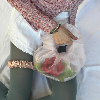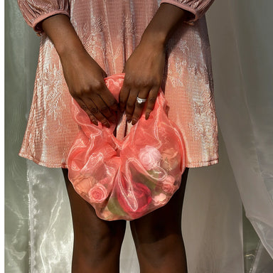 This pale pink clutch seamlessly blends refined elegance with playful artistry. Constructed from delicate nylon organza, it features an enchanting ...