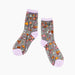 These updated sheer socks offer enhanced stretch and a silkier feel compared to the original design. Featuring an artistic blend of multicolored shapes complemented by subtle lavender highlights on the toes and heels, they combine style and comfort with refined elegance.