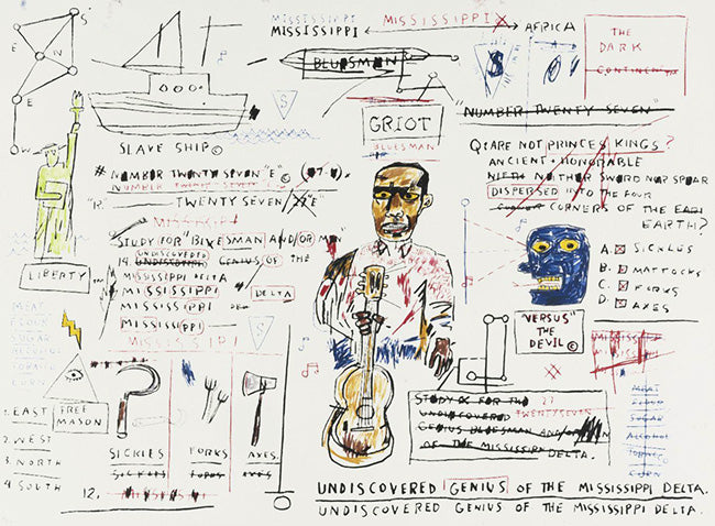 Jean-Michel Basquiat's Undiscovered Genius of the Mississippi Delta (1983)  that addresses African American history, racism, and inequality. Featuring imagery of cotton farming, slavery auctions, and Mark Twain, along with animals like rats and cows.  Combining abstract expressionism with symbolic phrases, it stands as one of Basquiat's most iconic works. Displayed in major retrospectives at the Whitney Museum, Serpentine Gallery, and Brooklyn Museum, the original painting sold for $23.7 million at a 2014 Sotheby's auction. Basquiat’s works are known for their emotional depth and exploration of profound social themes.