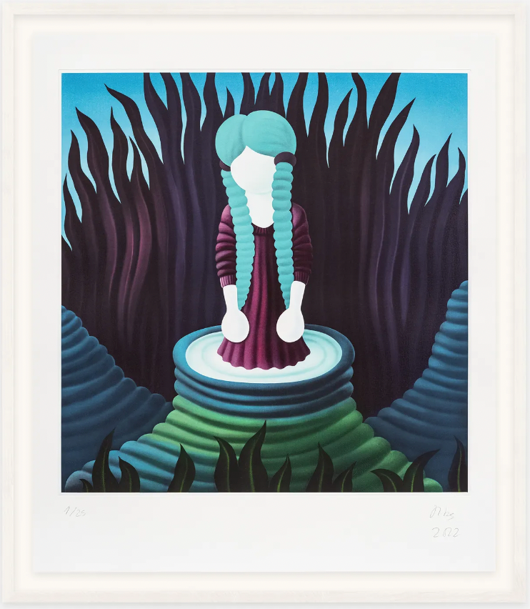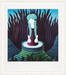 Hot Blue Bath reimagines Ribes' original oil painting through labor intensive photopolymer etching. The unusual medium allows the capture of both meticulous detail and dense pigment, resulting in a sleek but amply textured print. Uncanny and restricted by the coiled bath, the central figure is surrounded by an undulating, vegetal landscape seemingly ready to swallow them whole.